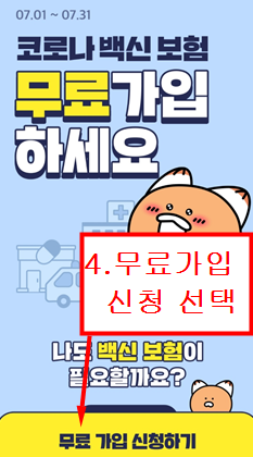 세번쨰. 배너를 선택하시면 아래처럼 '코로나 백신보험 무료가입하세요.'라는 창이 뜹니다.