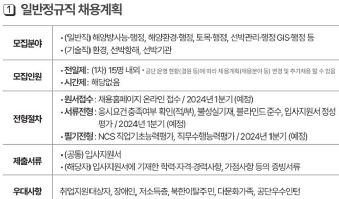 1. 모집분야 : 행정직, 해양방사능, 해양환경, 토목직, 선박관리, GIS.