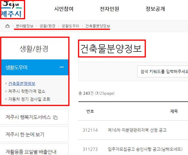 아래 알려드리는 제주시 홈페이지에서 들어가셔서 건축물 분양정보를 찾을수있습니다.