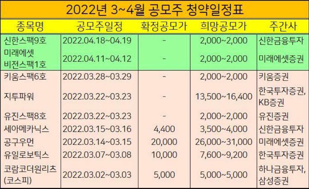 2022년 3월에 신규상장하는 공모주 일정을 표로 정리했습니다.