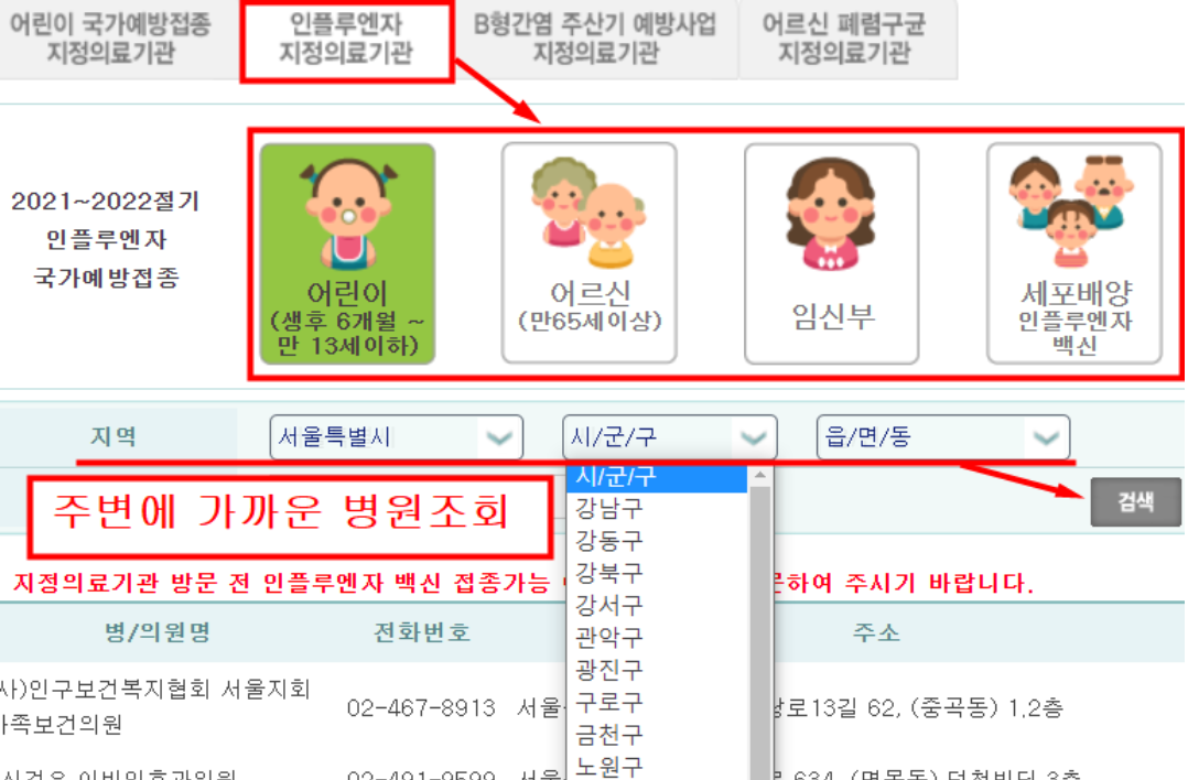 아래 가까운 독감 예방접종 지정병원을 병원을 찾는 홈페이지를 확인하세요.