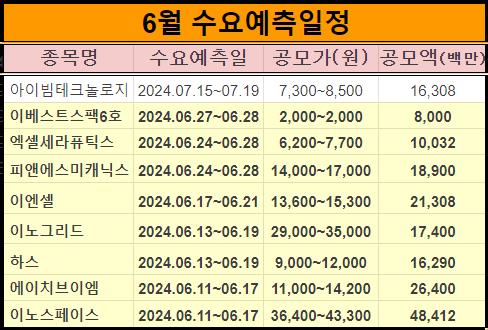 2024년 6월 공모주 청약일정을 표로 만들었습니다.